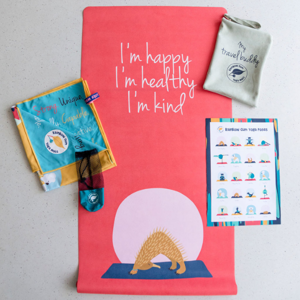 BONUS: Each kit comes with a kid yoga mat + travel yoga pouch + a beach towel + A3 yoga poses poster + 8 weeks of mindfulness tips and games